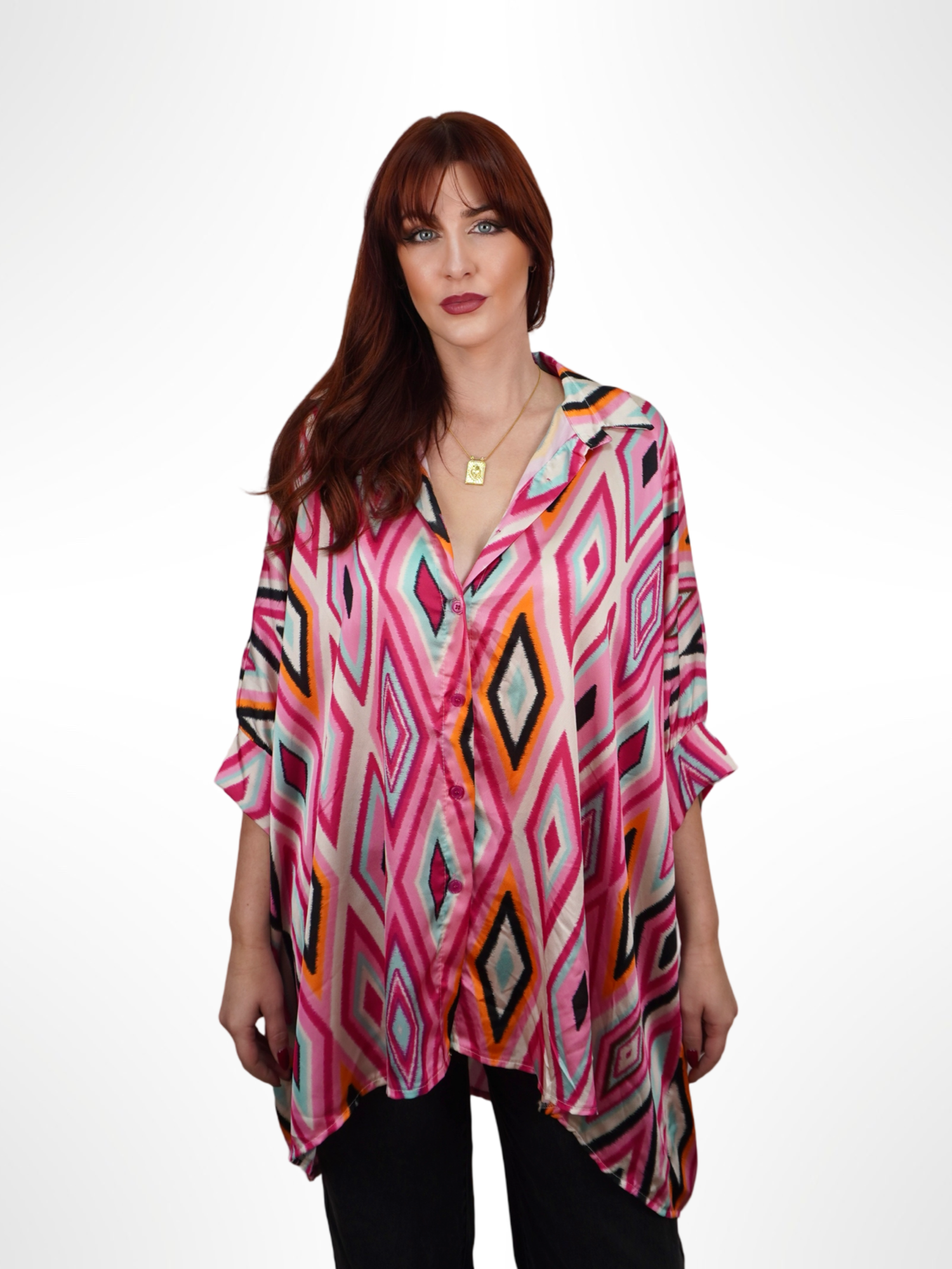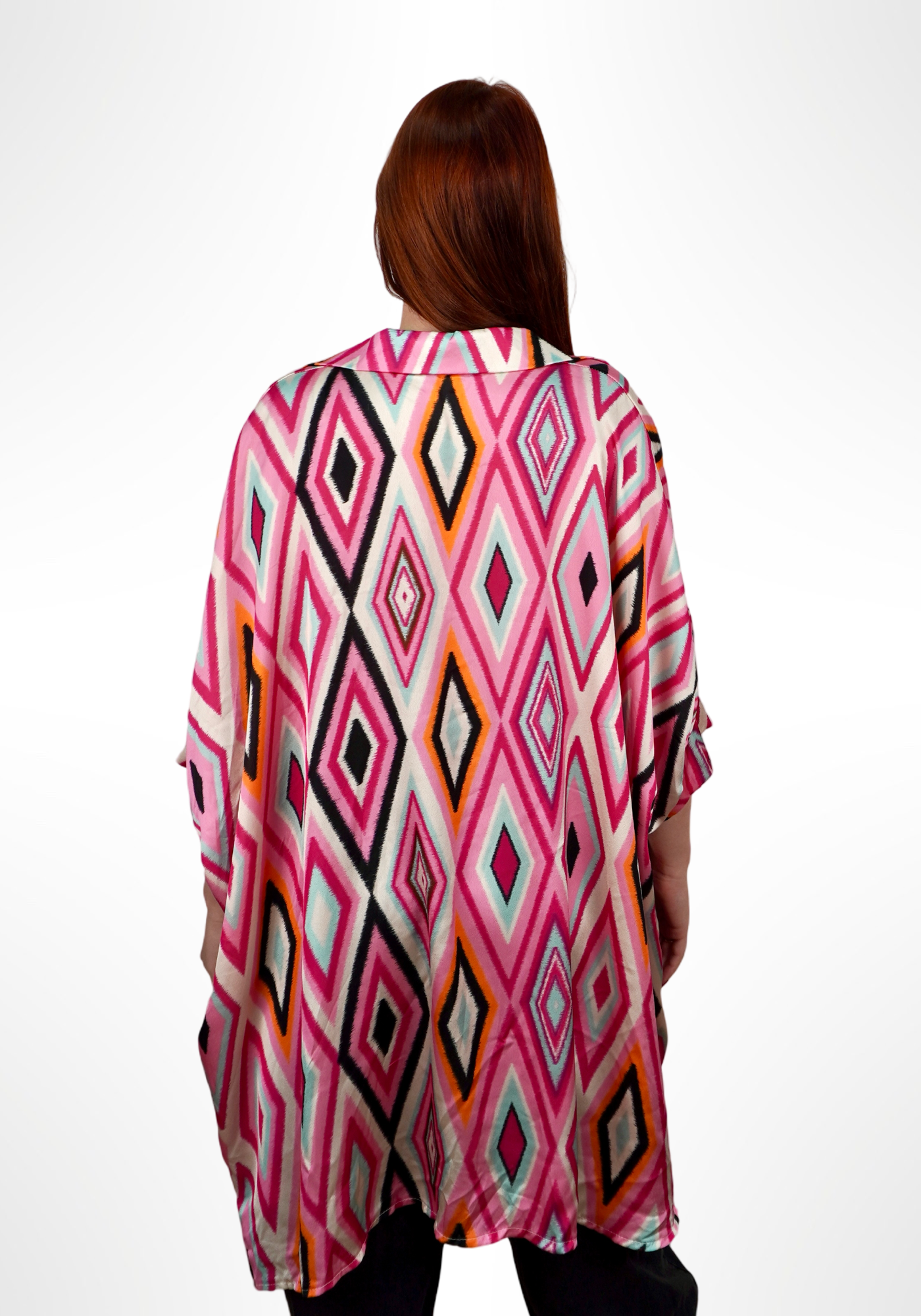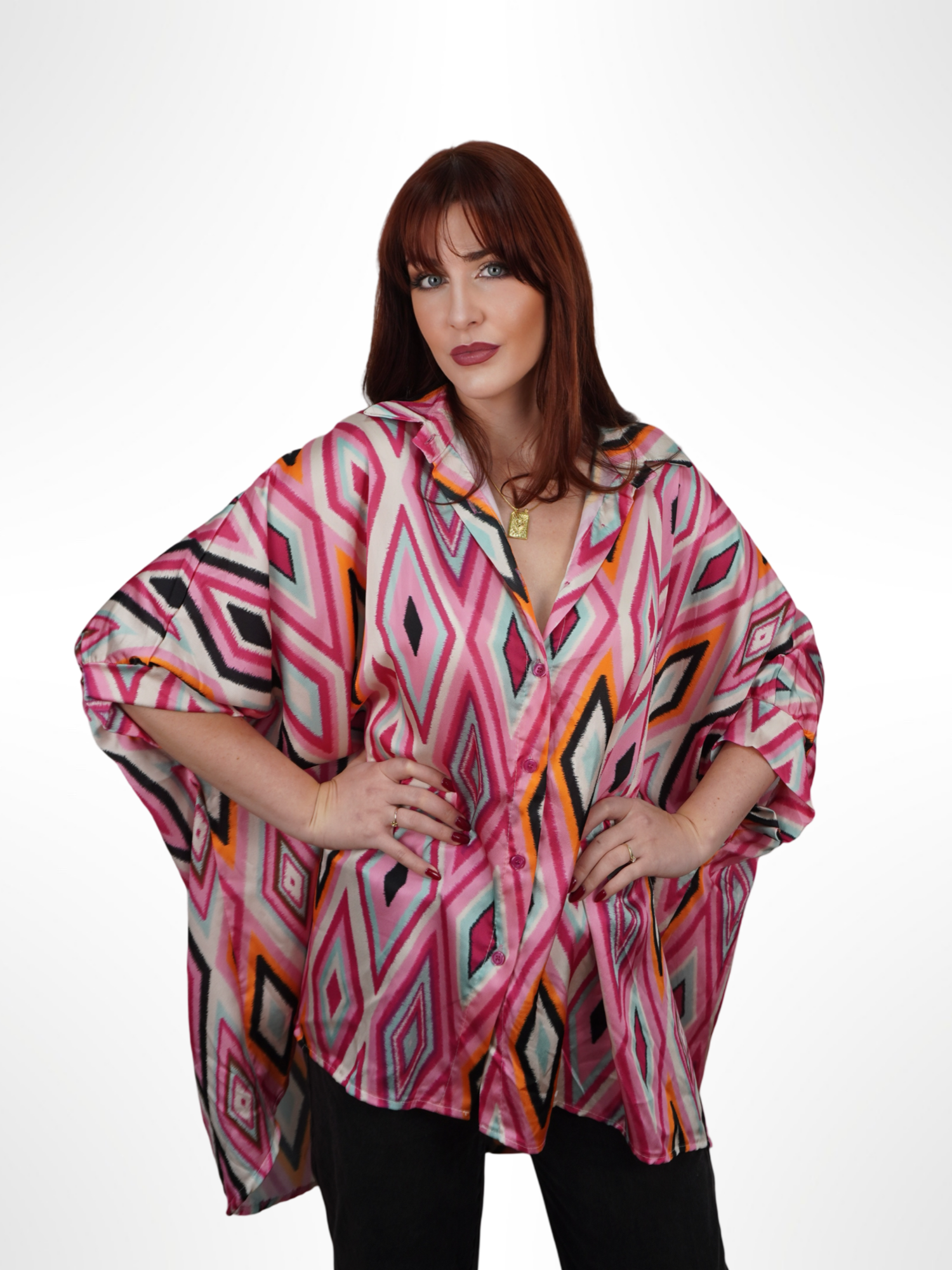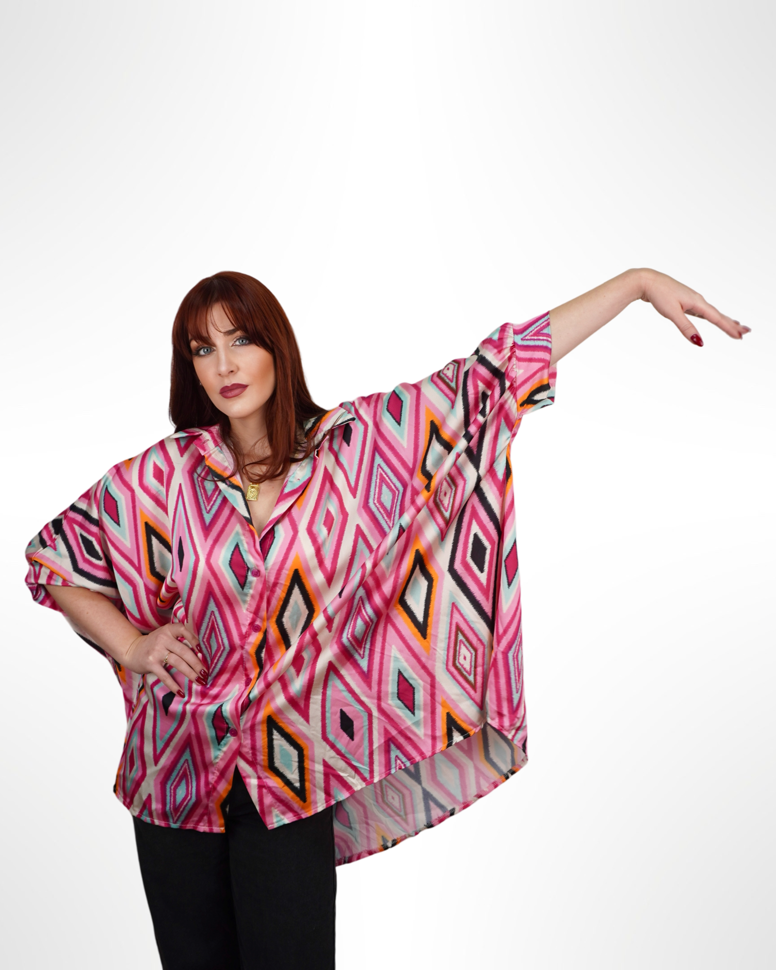 A BOHO GLARE neve nem véletlen: ez az ing egyszerre hozza a bohém életérzést és a vakító színdinamikát – mintha a nyári nap sugarai tükröződnének vissza egy kaleidoszkópban. A rózsaszínes, narancsos, fekete-fehér gyémántmintás minta minden nézőpontból mást mutat, a szabás pedig extrán különleges: széles, bő ujjrész, leomló oldalvonalak és hosszított fazon, amely szinte minden alkaton látványosan áll.