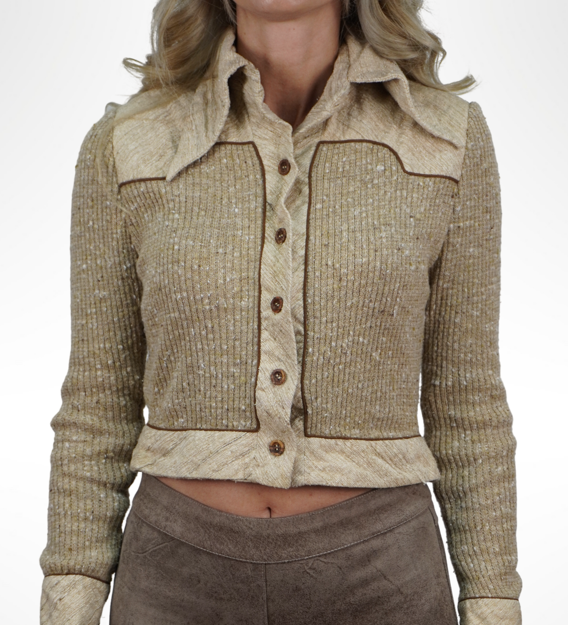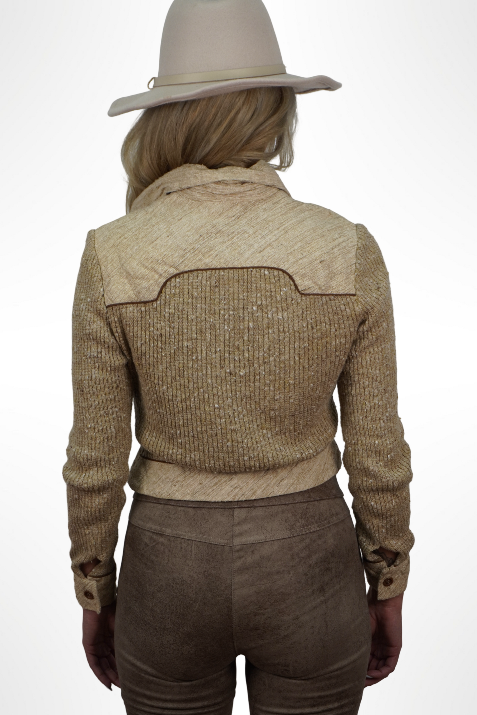 Mint egy suttogás a vörös sziklák között. Ez a különleges textúrájú vintage felső a természet színeit idézi meg: puha bézs és aranybarna árnyalatai meleg, nyugodt hangulatot árasztanak.
