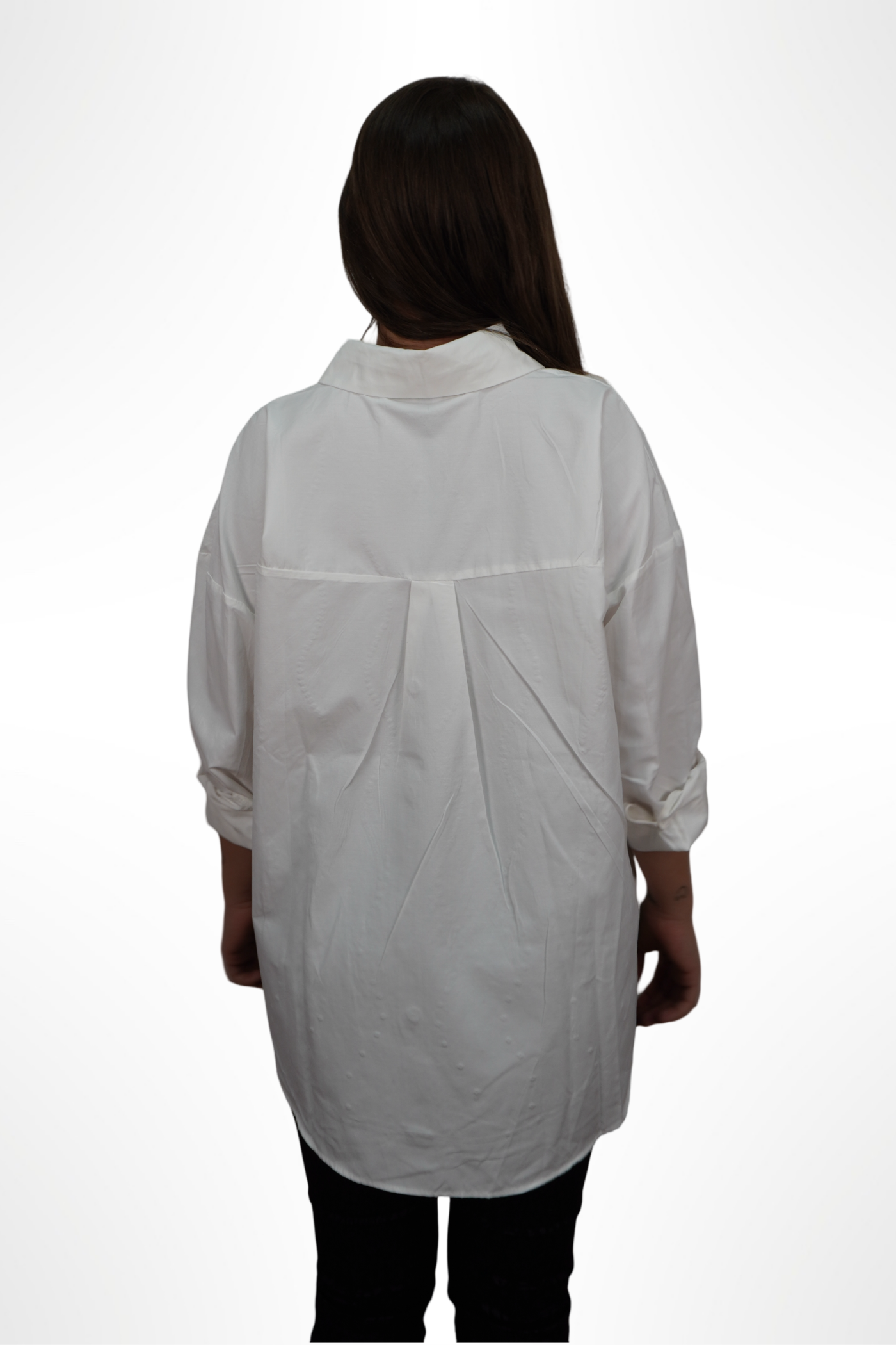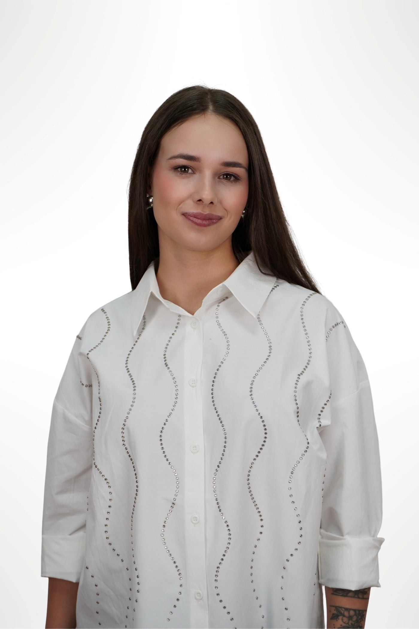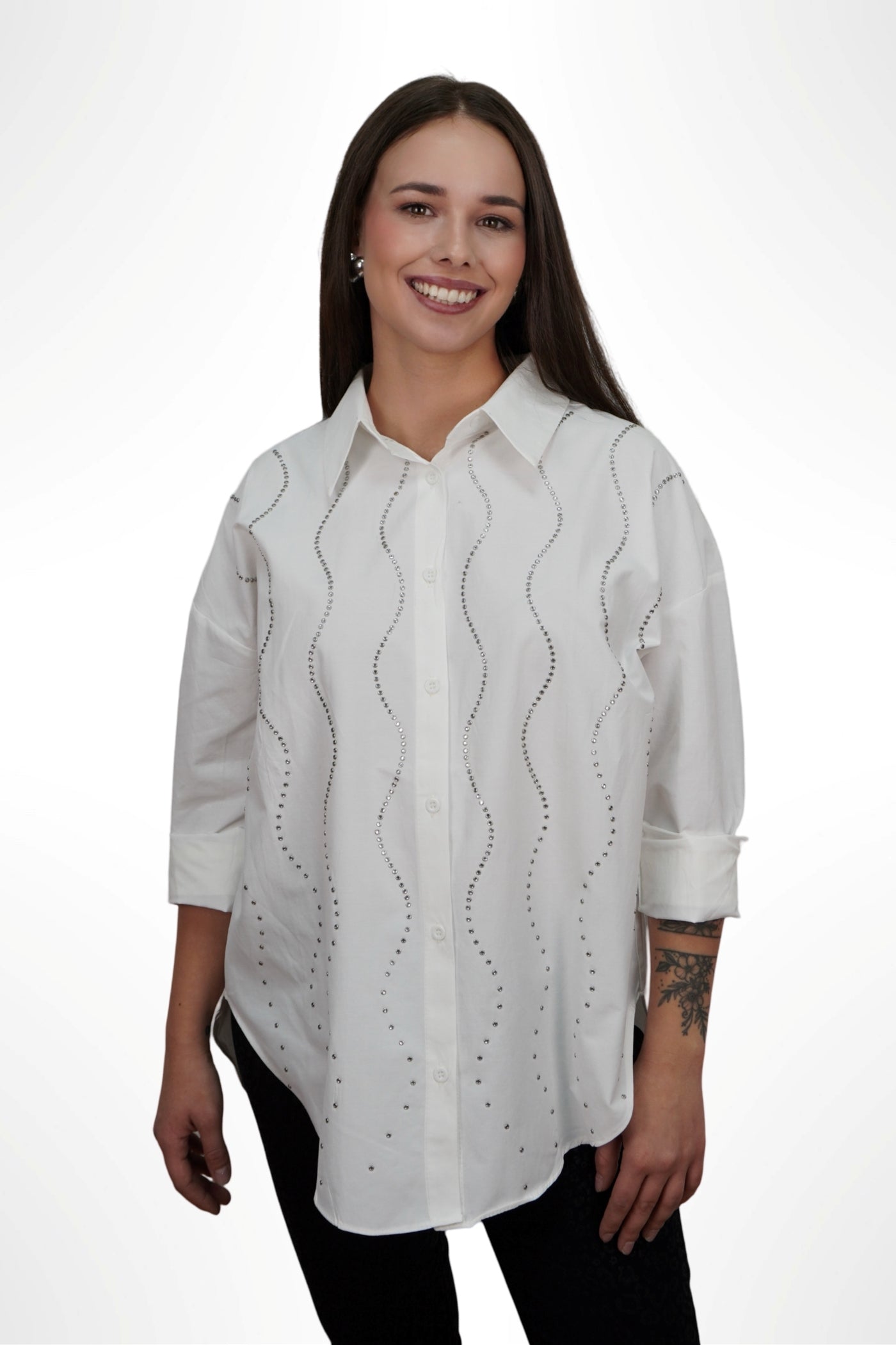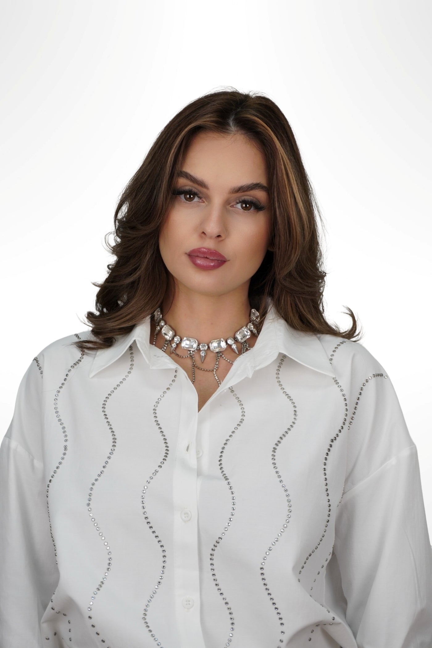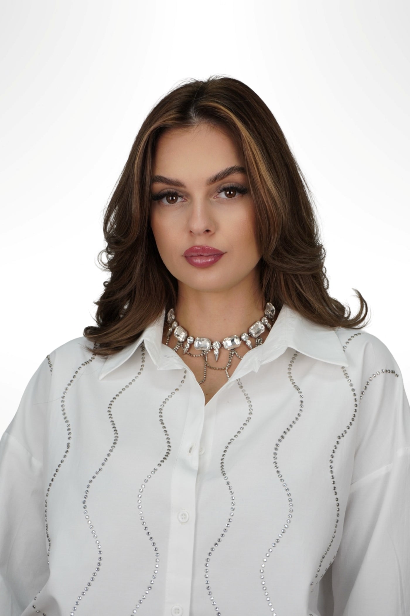 Laza szabású, hátul hosszított, oversize fazon, amely letisztult eleganciát ötvöz a látványos kristálydíszítéssel. Az anyaga kellemes tapintású, de a kézzel rátett, apró kristályszerű, szegecses részletek igényelnek különösen kíméletes bánásmódot.