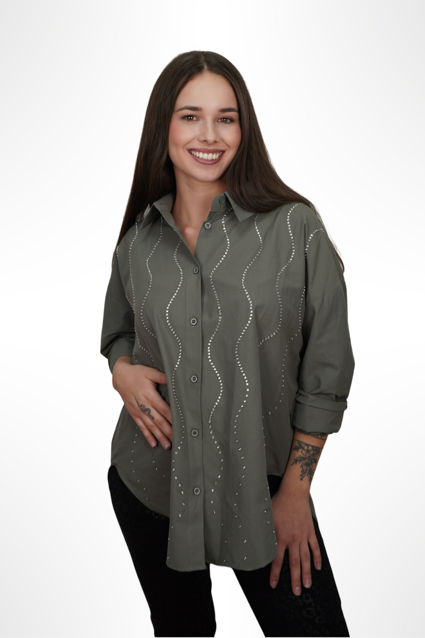 Oversize szabású, hátul hosszított, lezser viselet, amely nemcsak elegáns, de játékosan különleges is. Az anyaga puha viszkóz, kellemes tapintású, de a kézzel rátett, apró kristályszerű, szegecses részletek különösen kényesek – ezek igényelnek extra odafigyelést.