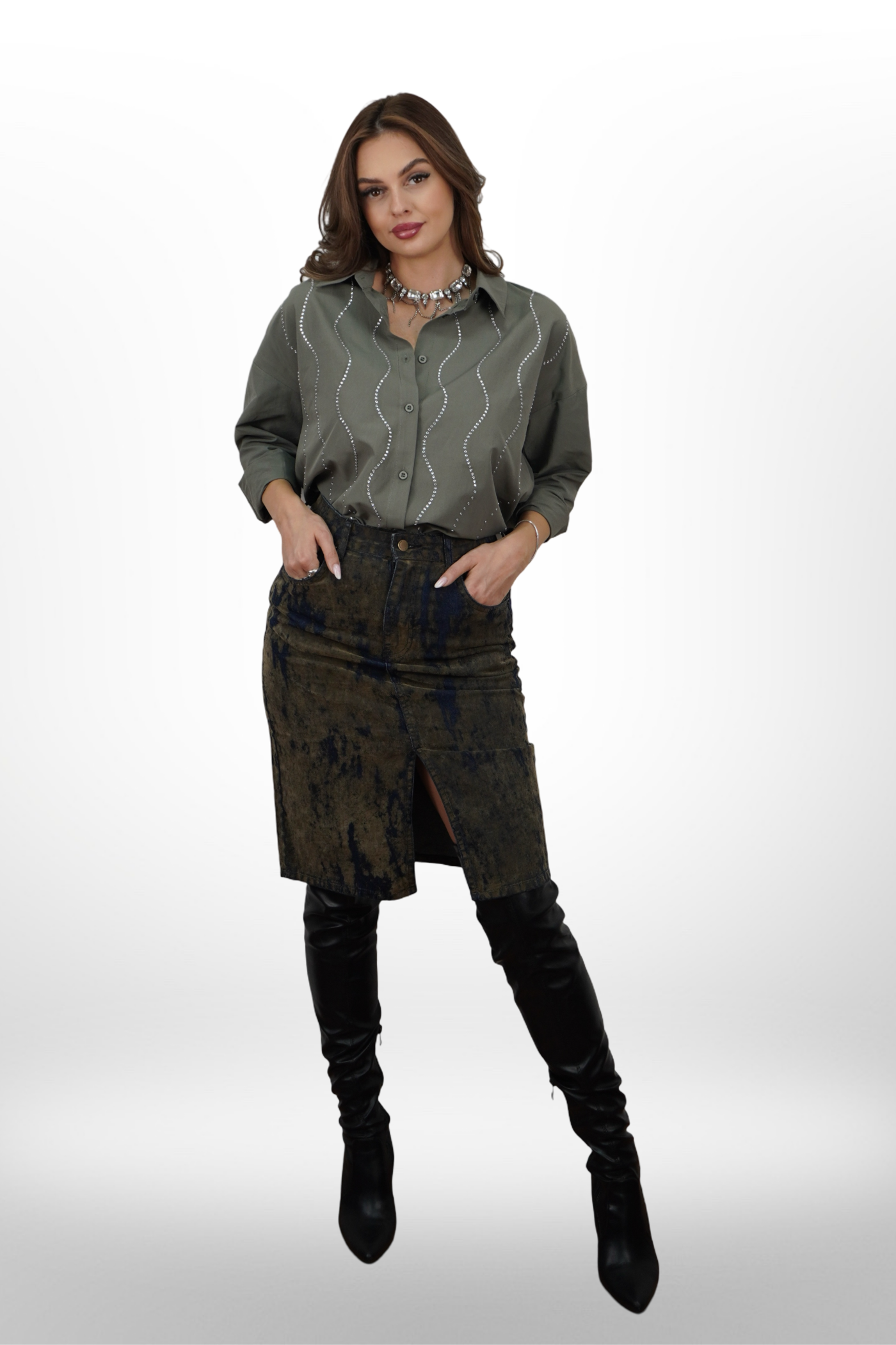 Az EARTH ALCHEMY egy karakteres, középhosszú ceruzaszoknya, amelynek zöldes, márványos felülete puha, bársonyos tapintású pigmenthatással díszített. A különleges mintázat szinte festett hatást kelt – minden darab egyedi, mintha maga a természet formálta volna.
