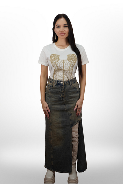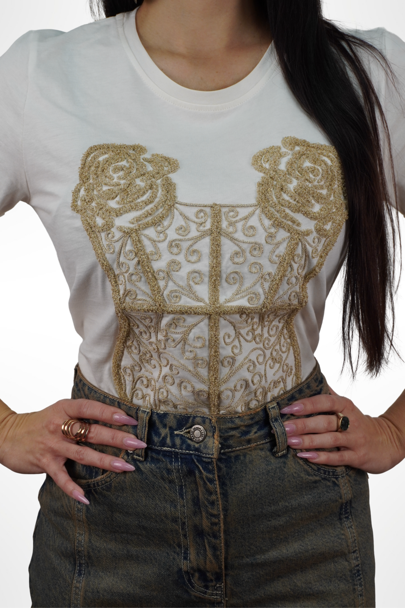 Ez a puha, törtfehér póló egy igazán különleges darab, amit az arany színű, elegánsan hímzett fűzőminta tesz egyedivé. Ízlésesen szexi megjelenést kölcsönöz, így tökéletes választás lehet akár egy hétköznapi szetthez is – ha szeretnél egy kis luxust csempészni a napodba.