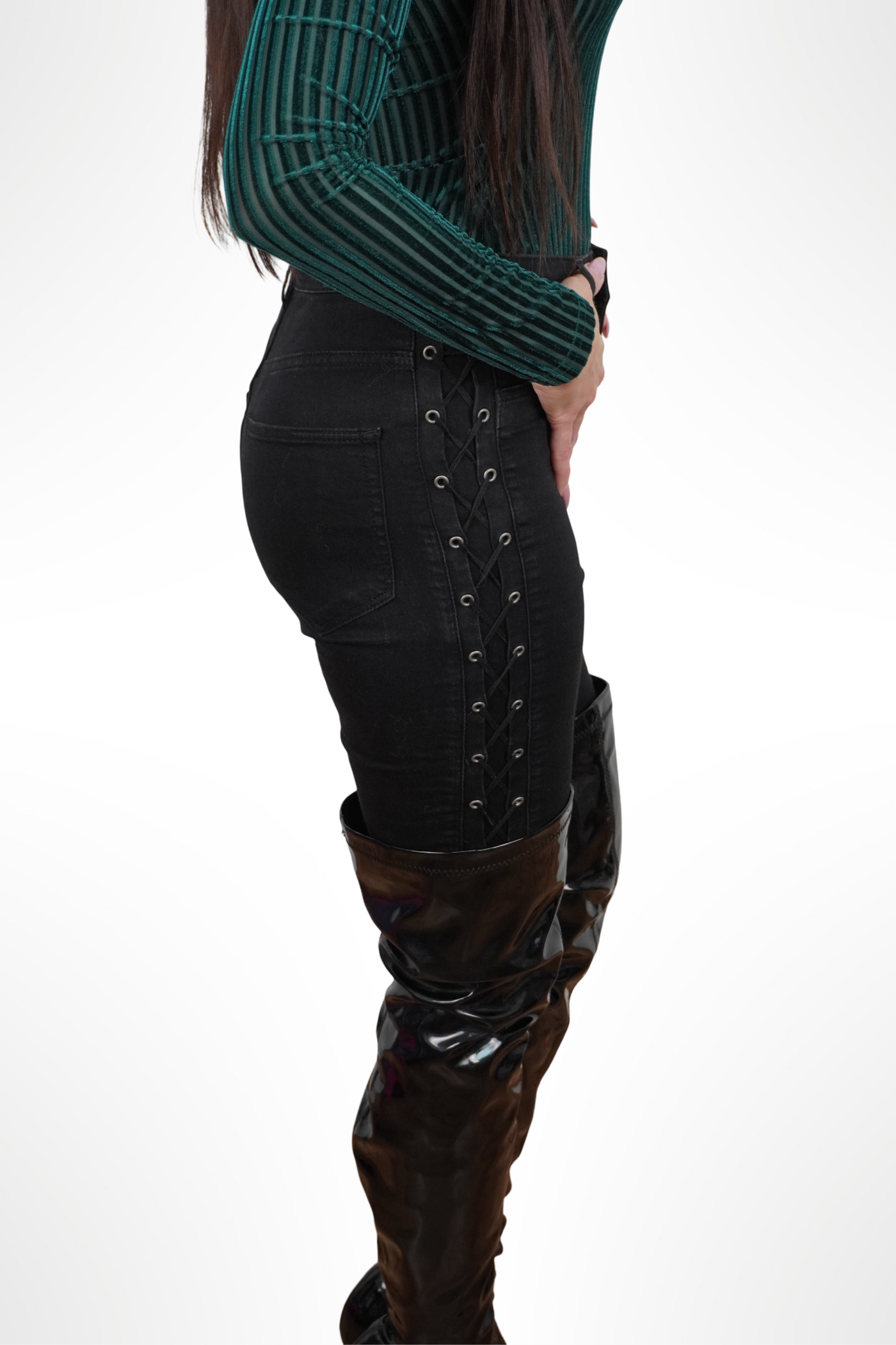 Ez a darab az obszidián kő misztikus erejéről és a benne rejlő női energiáról kapta a nevét. A mélyfekete szín, a formakövető szabás és az oldalán végigfutó fűzős részlet egyszerre elegáns és erőt sugárzó megjelenést ad. Bár hosszú csizmával fotóztuk, az oldalsó fűzős megoldás végigfut egészen a nadrág aljáig, ahol megkötős kialakítással zárul – így könnyedén szabályozható a sziluett.