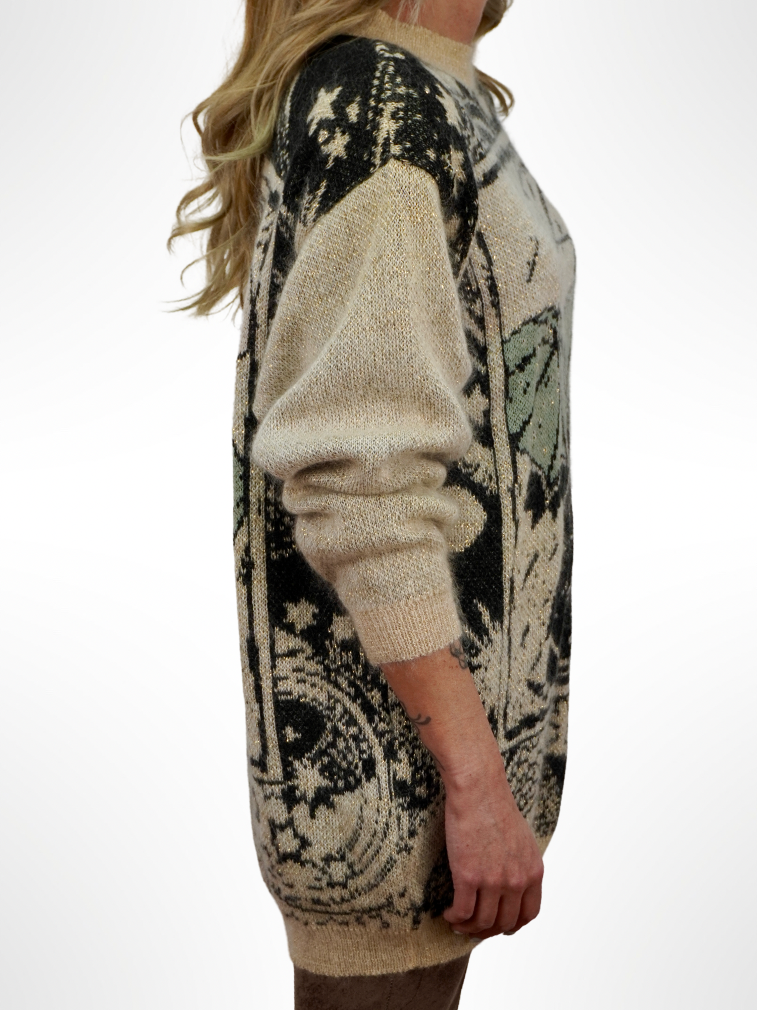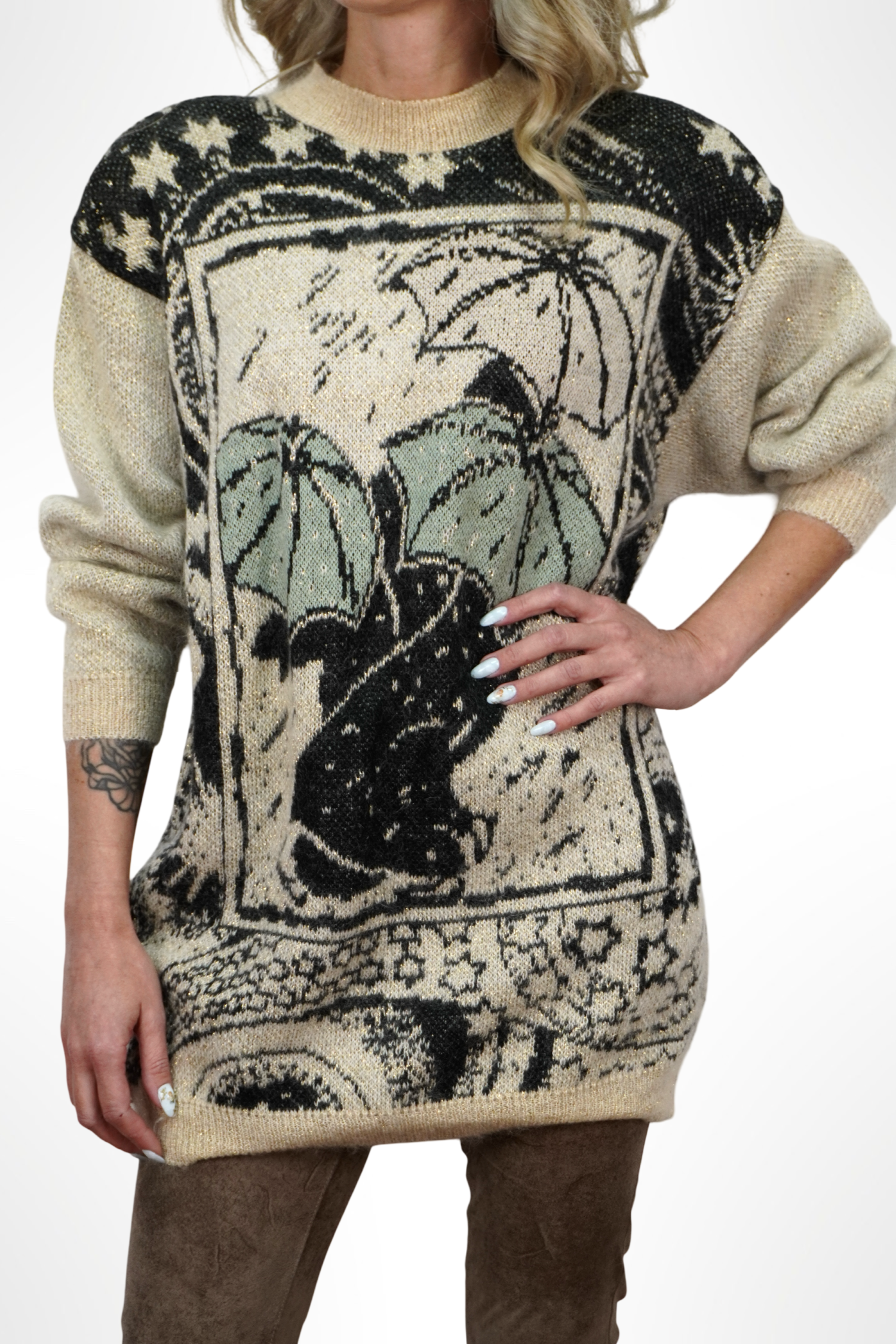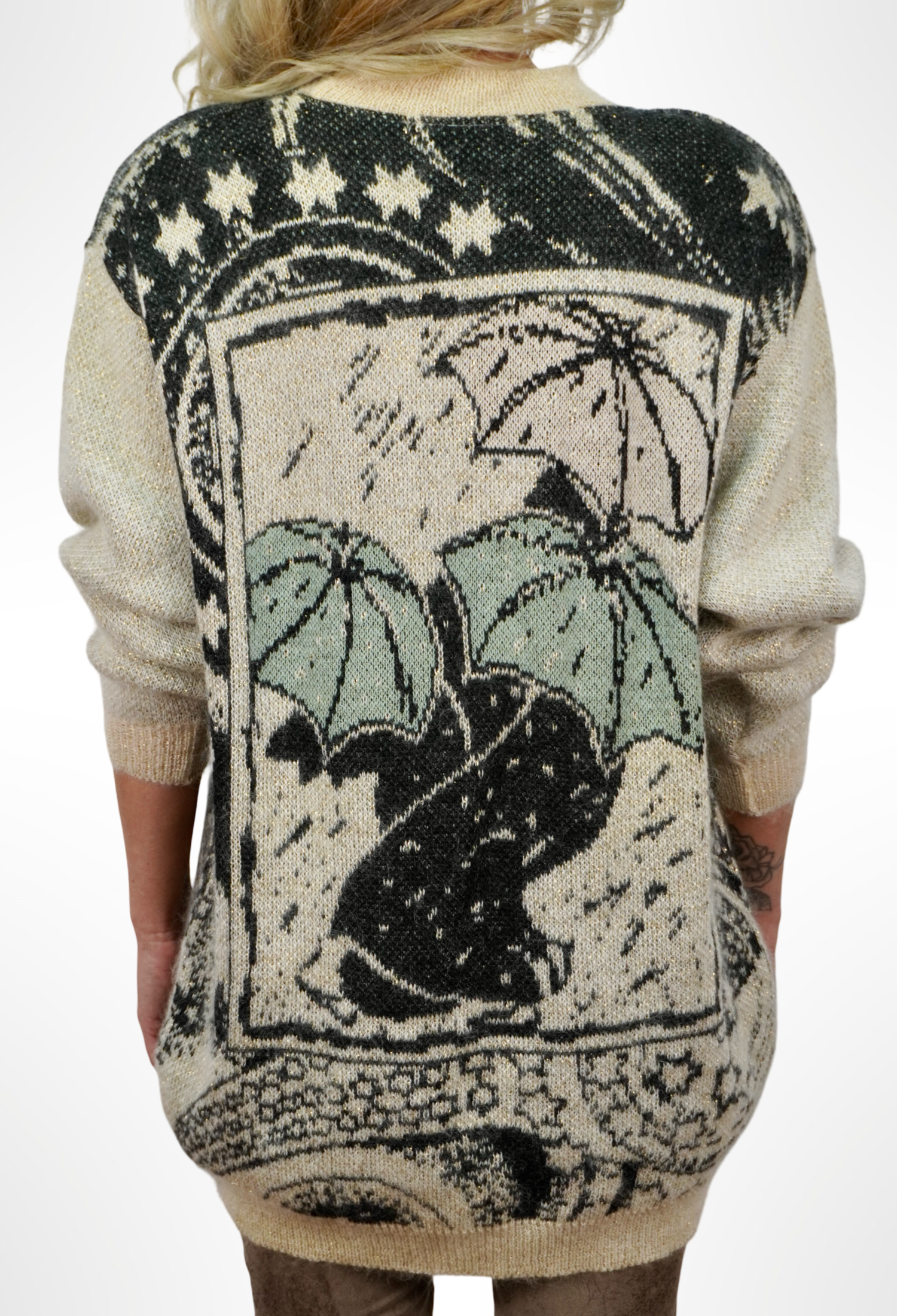 Ez a kötött pulcsi nemcsak meleg, hanem mosolyt is csal az arcokra. Egyedi mintáján esernyők táncolnak a szemünk előtt, mintha egy esős napon is ünnepet varázsolna. A krémszín alap és a zöld–fekete árnyalatok igazán karakteressé teszik.
