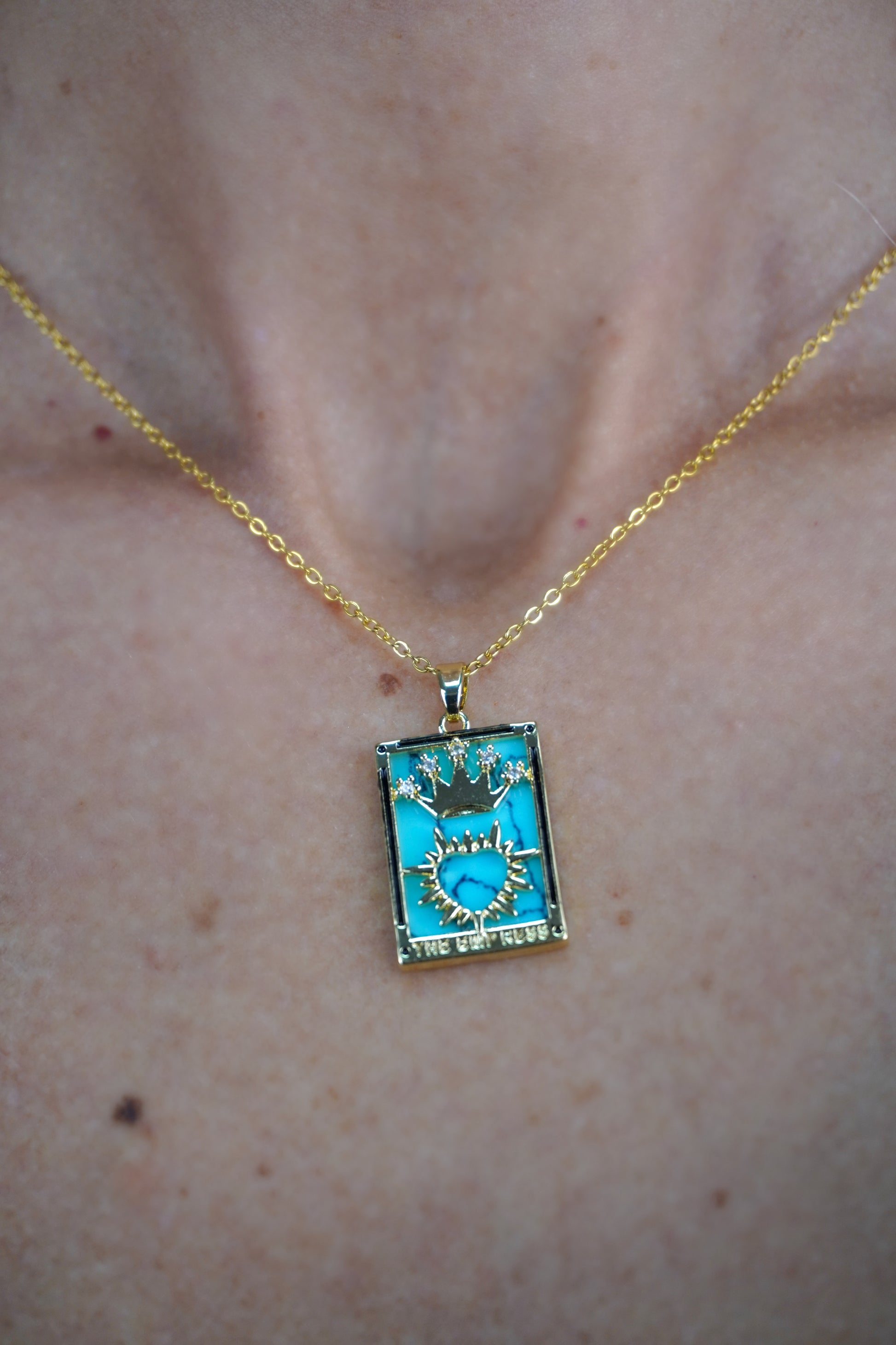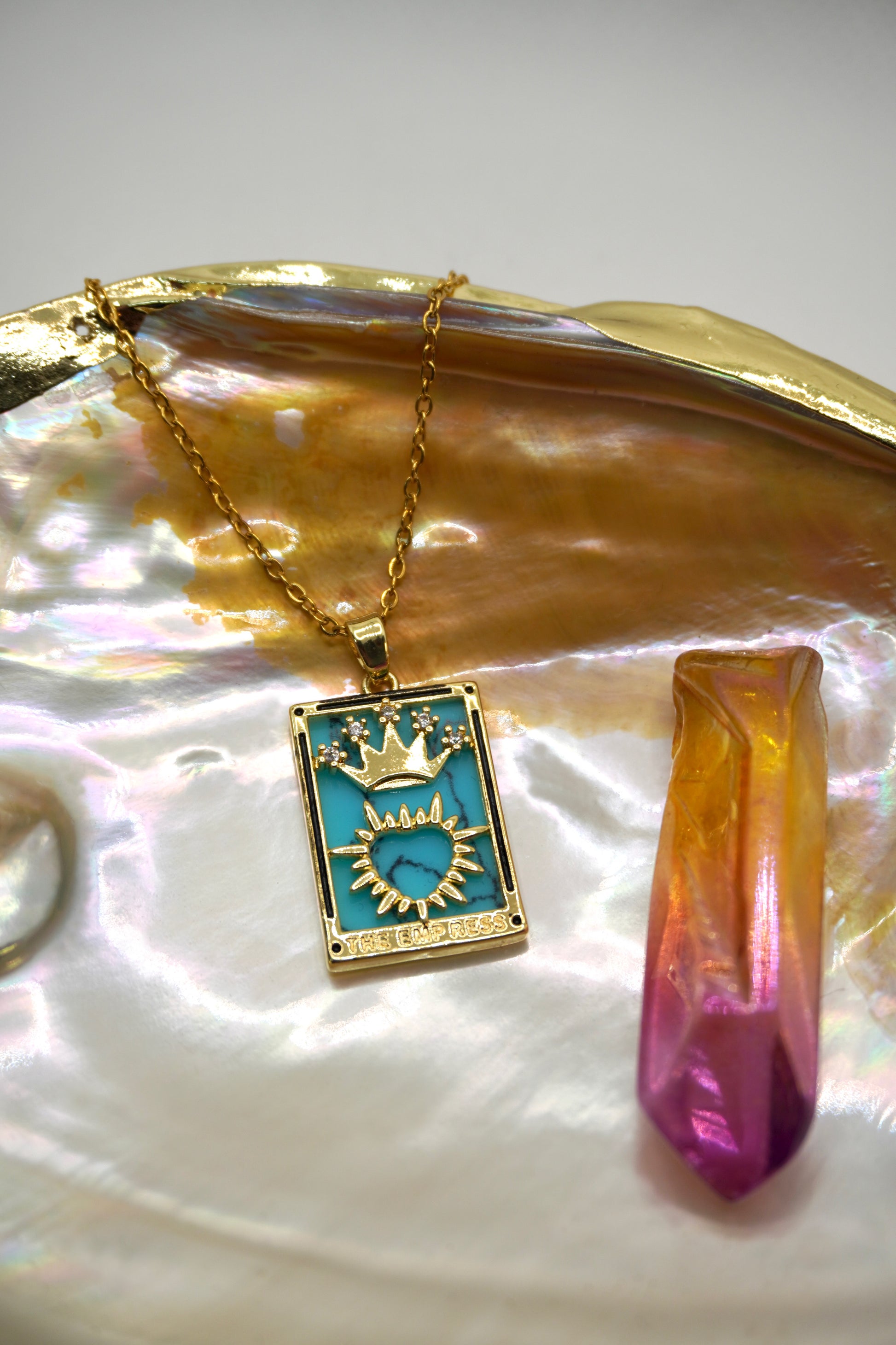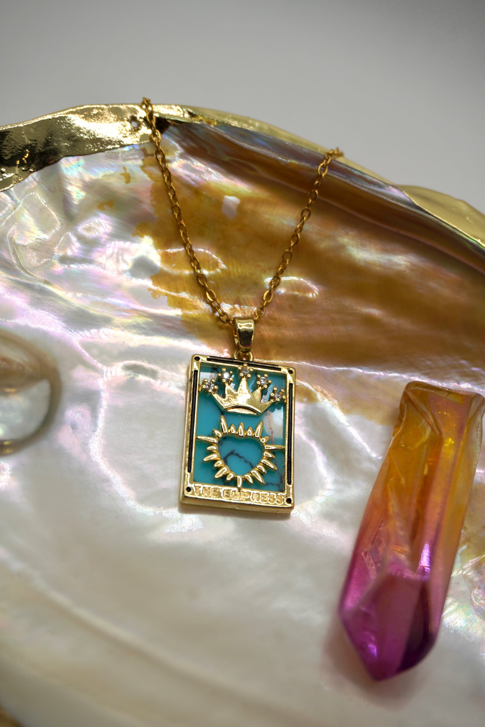 A THE EMPRESS a Nagy Arkánum 3. lapja, amely a növekedés, az alkotás és a termékeny, áramló életszakasz jelképe. A tarot hagyománya szerint az Uralkodónő a stabil, áldott, bőséget hozó időszakot mutatja – amikor minden, amihez nyúlunk, fejlődik, szépül és életre kel. Ez a nyaklánc így nemcsak ékszer, hanem egy olyan spirituális amulett is, amely támogatja a kreativitást és a belső harmóniát.