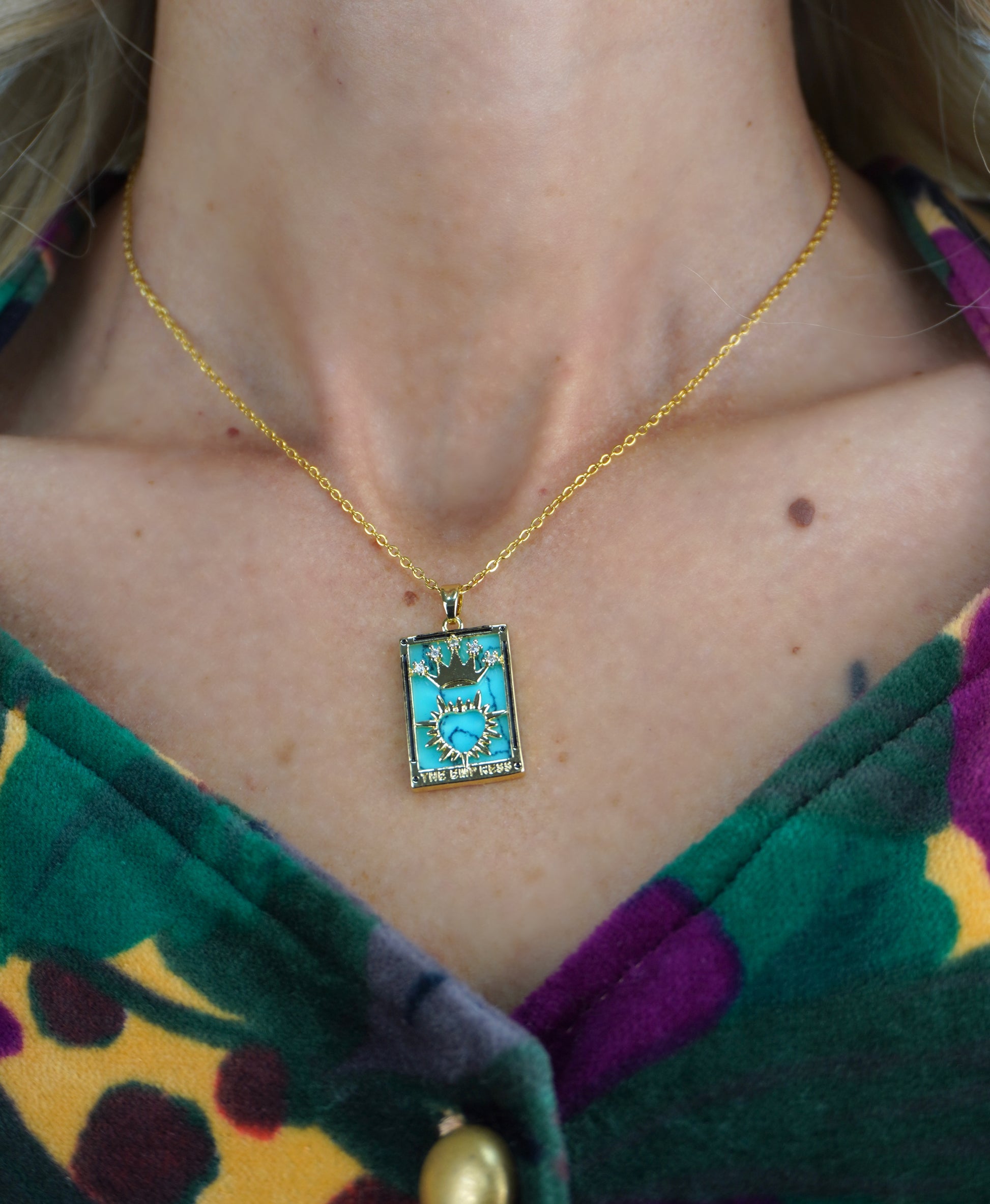 A medál türkiz alapszíne és arany részletei különleges, elegáns kontrasztot teremtenek, amely a klasszikus vintage tarot hangulatot idézi. Visszafogott mérete miatt mindennapi ékszerként is tökéletes.