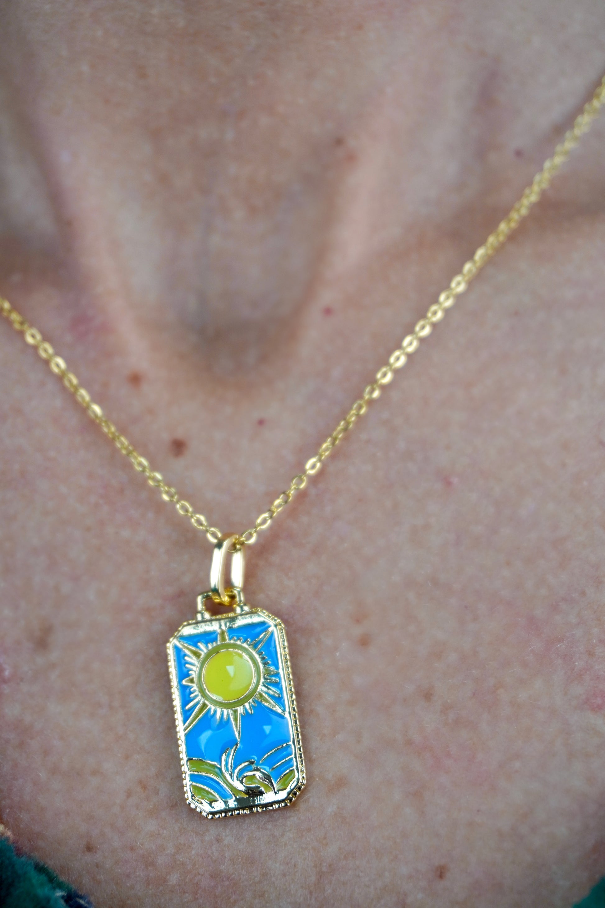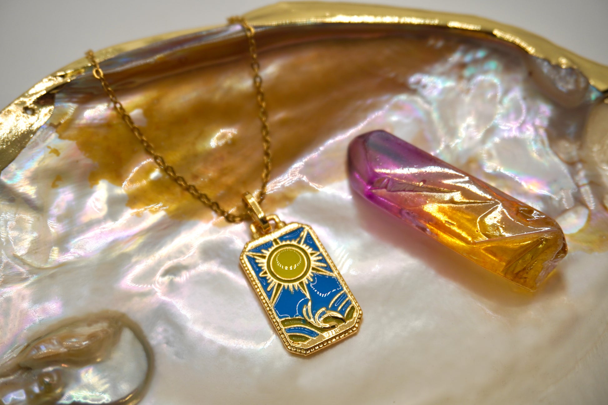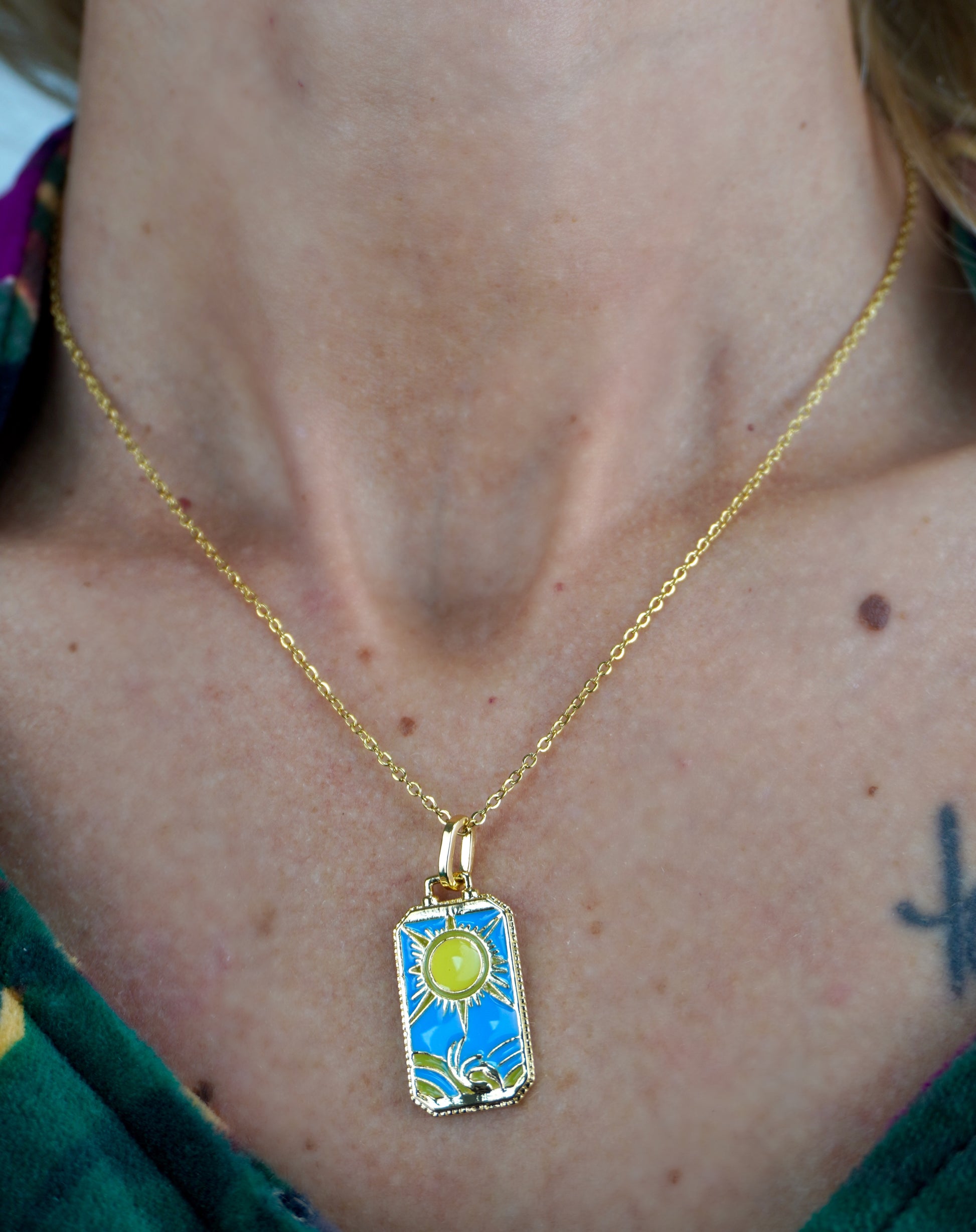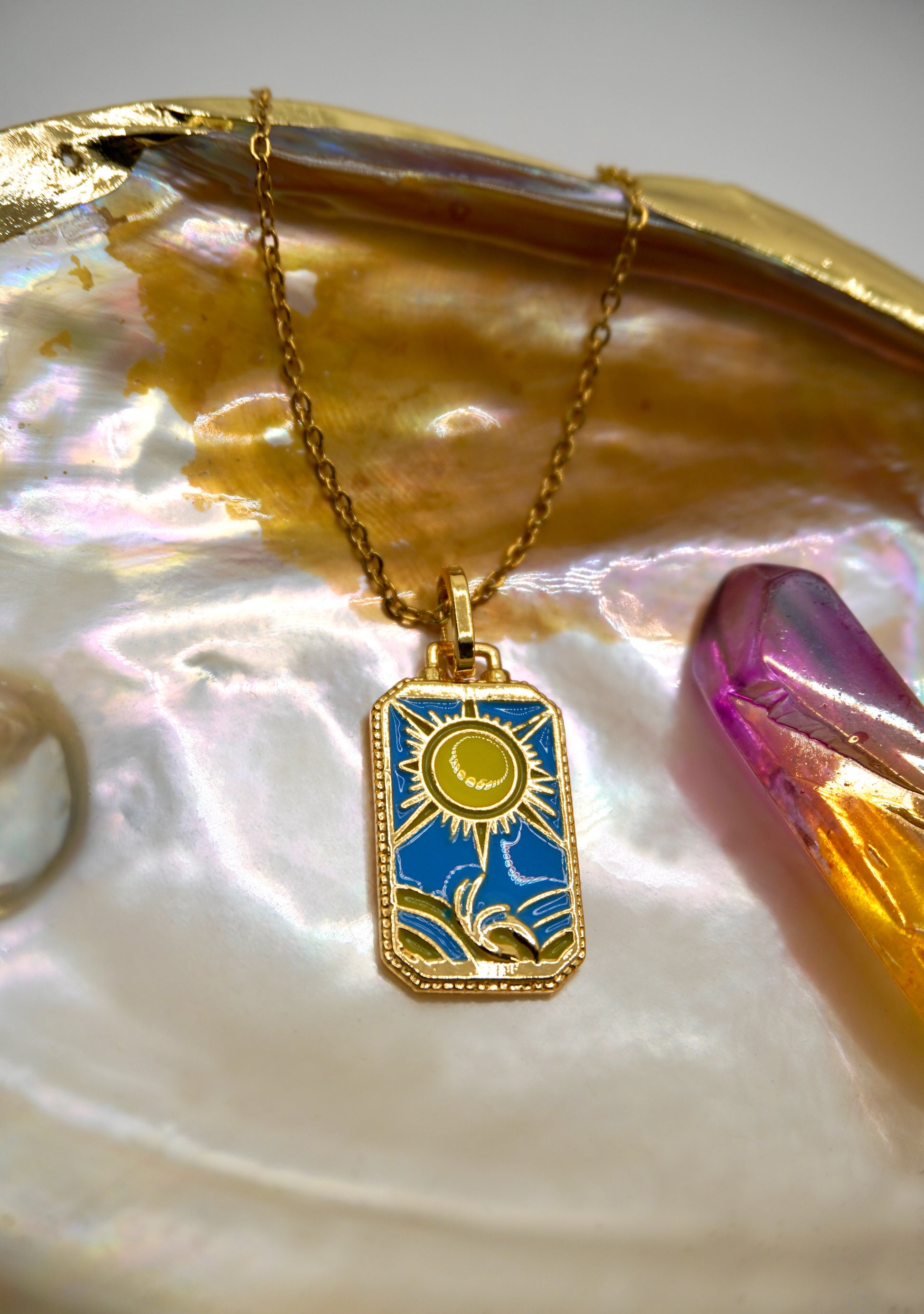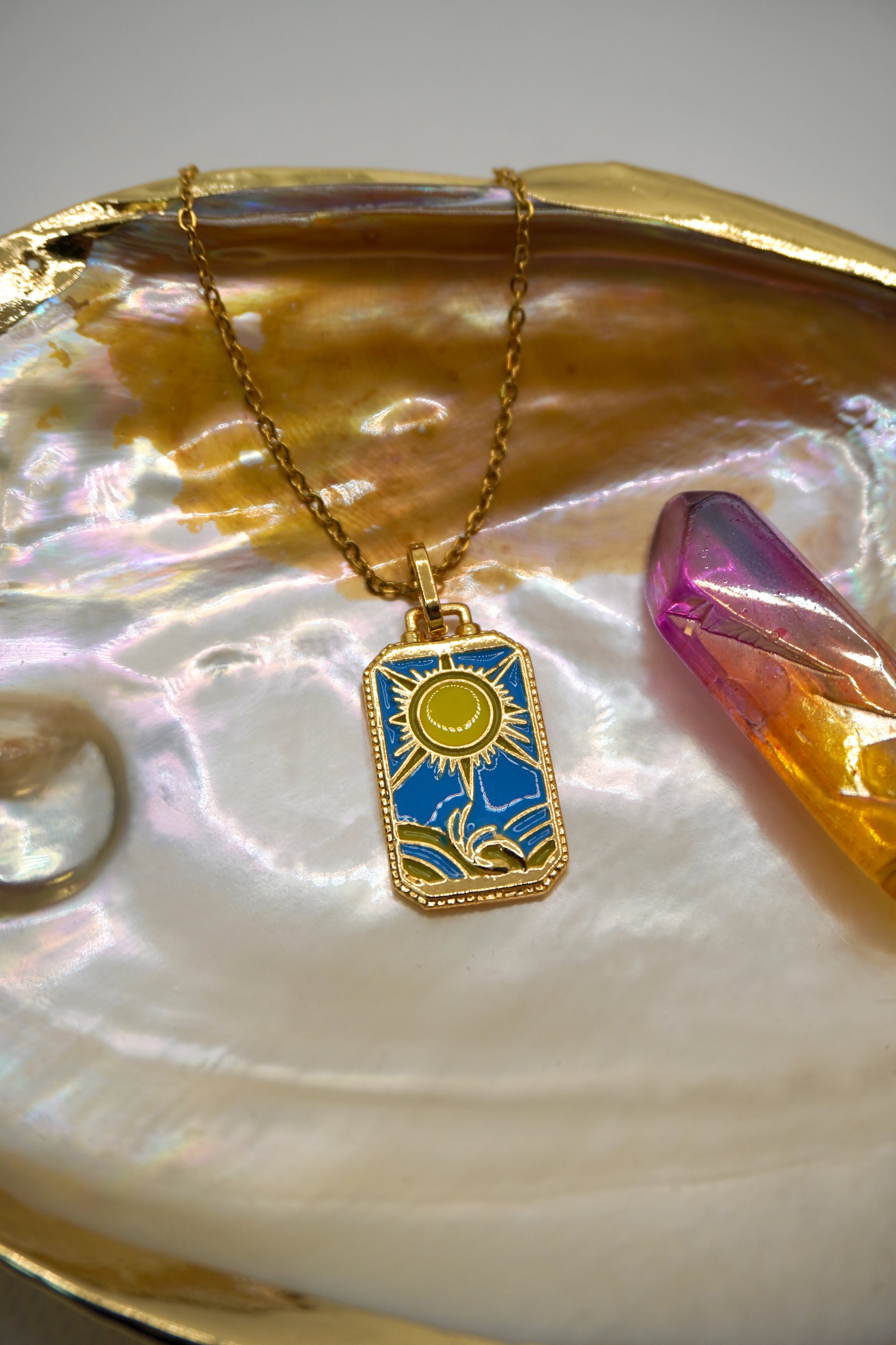 A THE SUN nyaklánc a tarot egyik legerőteljesebb és legpozitívabb lapjának energiáját hordozza. A ragyogó medál a Nap fényét és életadó erejét szimbolizálja: világosságot, örömöt, bőséget és a megújulás pillanatait. Egy olyan talizmán, amely felerősíti a belső fényt és a magabiztosságot minden nap.