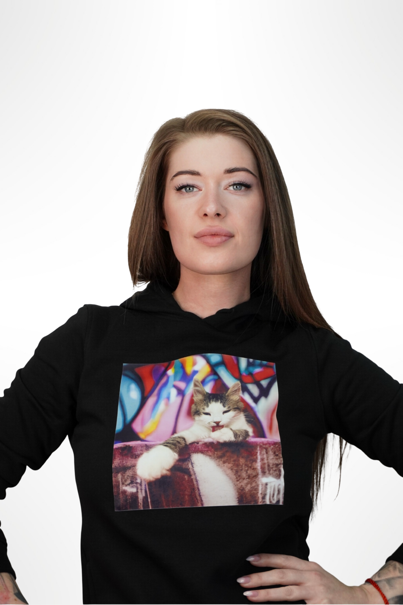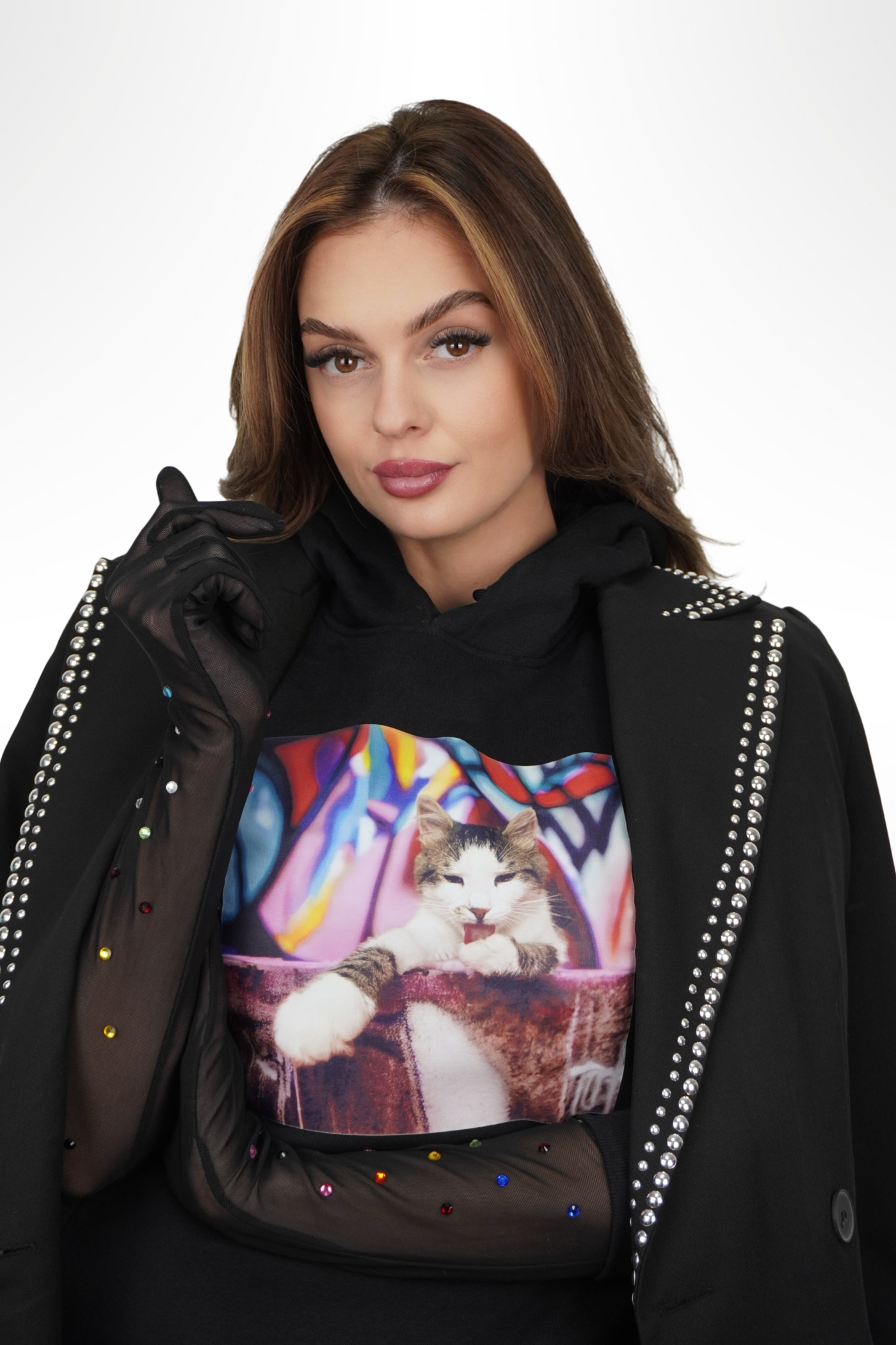 A pulcsin Lexy kiscicája, Milo szerepel – fiatalkori, vagány önmagában, amikor már nagy egyéniség volt, de még mindig serdülő cicaformában.
